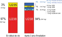 Au bout de trois ans d'irradiation, le combustible s'est transformé avec l'apparition de plutonium, de produits de fission et d'actinides mineurs. La composition du combustible irradié extrait du cœur d’un réacteur dépend de la quantité initiale de matière fissile et de l’énergie qui en a été extraite.