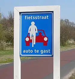 Une fietsstraat (rue cyclable) est une route où les vélos sont considérés comme le principal moyen de transport privilégié et où les voitures et autres véhicules motorisés sont autorisés « en tant qu'invités ». Il existe quatre types différents de fietsstraat, mais ils doivent tous avoir une limite de vitesse de 30 km/h ou moins et sont généralement colorés dans le même asphalte rouge que les pistes cyclables[34].