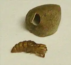 Si les conditions de chaleur et d’humidité sont favorables, la larve se transforme alors en chrysalide. L’orifice d’entrée refermé avec la soie permettra au papillon de s’échapper de la graine. Pendant cette étape de nymphose, la larve n’est plus active.