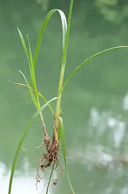 De la souche, jaillissent au printemps de longues feuilles plates de 3-10 mm de large et de 30-40 cm de long, carénées[N 1], luisantes, au bord rude. De couleur vert clair, elles prennent des teintes orangées à l'automne.