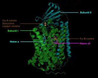 Le cytochrome a3 et le centre CuB forment un centre binucléaire qui est le site de réduction de l'oxygène O2 en H2O[3]. À l'état le plus oxydé, les cations métalliques Fe3+ et Cu2+ de ce centre binucléaire sont distants de 4,5 Å; et sont coordonnés à un anion hydroxyde HO−.