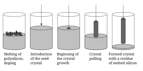 La méthode consiste en une solidification dirigée à partir d'un germe monocristallin de petite taille. On part du matériau fondu à une température juste au-dessus du point de fusion, avec un gradient de température contrôlé. Le germe est placé dans une « navette » suspendue au-dessus du liquide par une tige. Le liquide se solidifie sur le germe en gardant la même organisation cristalline (épitaxie) au fur et à mesure que l'on tire le germe vers le haut tout en le faisant tourner (à vitesse très lente).