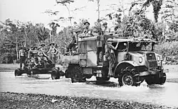 Après le débarquement à l'est de Lae, la 7e division, s'étant concentrée à Port Moresby, est transportée par avion à Nadzab après sa capture par le 503e régiment d'infanterie parachutiste américain (503e PIR) le 5 septembre. Chargé d'avancer depuis le nord-ouest, son rôle principal est de servir de tampon entre la 9e division et les renforts japonais qui pourraient tenter de descendre à travers les vallées de Markham et de Ramu[58]. L'avancée initiale de la 9e division le long de la côte rencontre une résistance limitée, les éléments japonais les plus importants étant principalement de la taille d'une compagnie. En réponse au débarquement à Nadzab, le commandement japonais ordonne à la 51e division du lieutenant-général Hidemitsu Nakano de renforcer la garnison fortement retranchée de Ryoichi Shoge à Lae, se repliant de la région de Salamaua[59]. La zone est parsemée de nombreuses petites criques et rivières à l'ouest du Buso, y compris quatre rivières principales et sur la route intérieure. Le 2/23e bataillon d'infanterie, après avoir traversé le Buso le premier jour, commence une péripétie de ce que l'auteur Joseph Morgan décrit comme « des traversées de rivière perfides et des efforts difficiles ... à travers la jungle »[60].