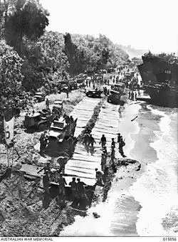 L'opération de débarquement se poursuit malgré les attaques aériennes et dans les quatre heures suivant la mise à l'eau de la première péniche de débarquement, environ 8 000 hommes sont débarqués[51]. Au cours de la phase initiale du débarquement, le 2/13e bataillon d'infanterie débarque à Yellow Beach pour sécuriser la tête de pont, puis pousse les patrouilles vers l'ouest, pour rejoindre le 2/15e bataillon d'infanterie – débarqué à Red Beach – avant d'avancer vers l'est vers la station de mission Hopoi pour sécuriser le flanc droit. Le 2/17e bataillon d'infanterie débarque sur Red Beach derrière le 2/15e et se pousse vers l'ouest pour se frayer un chemin à travers la rivière Buso et établir une tête de pont sur sa rive opposée. La 26e brigade d'infanterie suit ensuite la 20e brigade à terre, effectuant un passage de lignes avec la 20e brigade, traversant leur position puis poussant vers l'ouest, prenant temporairement le contrôle du 2/17e bataillon d'infanterie[52].