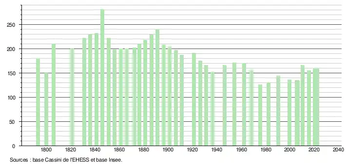 L'évolution du nombre d'habitants est connue à travers les recensements de la population effectués dans la commune depuis 1793. Pour les communes de moins de 10 000 habitants, une enquête de recensement portant sur toute la population est réalisée tous les cinq ans, les populations de référence des années intermédiaires étant quant à elles estimées par interpolation ou extrapolation[10]. Pour la commune, le premier recensement exhaustif entrant dans le cadre du nouveau dispositif a été réalisé en 2005[11].