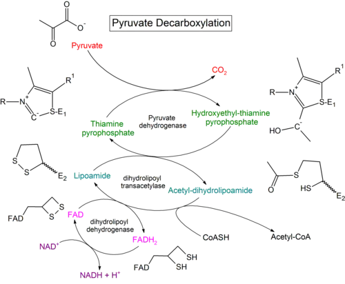 La décarboxylation du pyruvate, ou décarboxylation oxydative, est la réaction chimique catalysée par le complexe pyruvate déshydrogénase reliant la glycolyse au cycle de Krebs[1] en convertissant le pyruvate en acétyl-CoA :