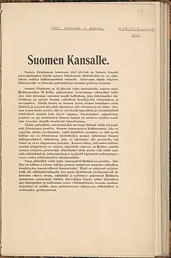 (...) Le peuple de Finlande ose attendre, avec confiance, que les autres nations du monde reconnaissent, qu'en possession de sa totale indépendance et liberté, le peuple de Finlande fera de son mieux pour atteindre son objectif qui est de se gagner une place au sein des peuples civilisés. »