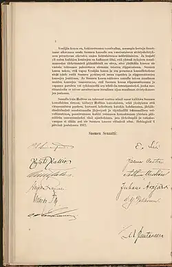 Image de la Déclaration (en finnois) avec les signatures des sénateurs. | ||