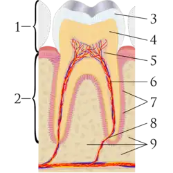 Les dents ont une fine couche d'émail sur la surface extérieure. La couche d'émail est plus blanche et semi-transparente et apporte des teintes bleues et roses à la couleur des dents[6]. La couche de dentine sous-jacente est plus foncée que l'émail, de couleur jaune-brune et moins transparente. La dentine constitue l'essentiel de la substance dentaire[7], et contribue le plus à la couleur générale des dents. Au cœur de la dent se trouve un tissu conjonctif mou appelé pulpe dentaire[8]. La pulpe est rose / rouge en raison de sa vascularisation, mais est rarement visible à travers l'émail et la dentine sus-jacents à moins que l'épaisseur de ces couches ne soit réduite par l'usure des dents ou, plus rarement par une résorption interne.