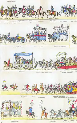 Les hérauts du Prince à cheval formaient, devant la Ranzengarde, les premiers rangs du cortège. Derrière eux se trouvaient les porteurs de drapeaux ainsi que la Ranzengarde dont les soldats arboraient leur nouvel uniforme, nombre d’entre eux portant de faux ventres rembourrés et de longues tresses. Le Seigneur Carnaval et sa cour se tenaient sur les chars qui accompagnaient le défilé. Celui-ci commence son chemin du manège, passe la place du château (Schlossplatz) puis la Große Bleiche pour arriver jusqu’au marché. C’est à cet endroit qu’a lieu le moment le plus important de la procession : le Seigneur Carnaval y est sacré puis couronné roi avant de rendre hommage aux habitants de la ville. Ce premier défilé accueille également l’inauguration du drapeau et la prestation de serment des recrues de la Ranzengarde, qui sont encore aujourd’hui des moments phares du cortège de rue. Pour cette première édition, le défilé est clôturé par un tour de chapeau dans le parc portant à l’époque le nom de Neue Anlage.