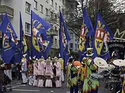 Les porteurs de fanions et d’étendards incarnent également une longue tradition mise en place par le MCV. Ils portent des étendards surdimensionnés aux couleurs traditionnelles du carnaval de Mayence : rouge-blanc-bleu-jaune. Les fanions sont ornés, par exemple, de symboles typiques du carnaval de Mayence comme les Weck, Worscht und Woi (pain, saucisse et vin). Il en est de même pour les « têtes enflées », qui depuis le début des années 1920, prennent part au défilé à différents du cortège. Il s’agit de têtes surdimensionnées en papier mâché, qui caricaturent les personnalités et physionomies typiques de Mayence. La participation à carnaval est même gérée par une association à part entière.