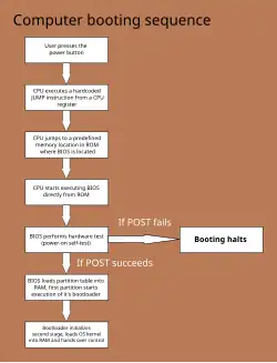 L’ordinateur exploite un programme réduit, le chargeur d'amorçage, permettant d’extraire un programme accessible via un périphérique de stockage permanent ou amovible. Ce dernier est typiquement le noyau du système d’exploitation, qui s’installera en RAM (la mémoire vive) et appellera lui-même des programmes applicatifs.