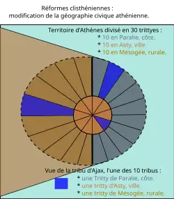 L'Attique est divisée en trois ensembles : l'aire urbaine (asty), l'aire littorale (paralie) et l'intérieur (mésogée). Dans chaque ensemble se trouvent dix groupes de dèmes, nommés trittyes. La réunion de trois trittyes, une de chaque ensemble, forme une tribu, phylè : il y a donc dix tribus. Chaque tribu regroupe plusieurs membres ; ils sont mélangés et non pas classés par culture, région et classes sociales afin que la population soit répartie de manière homogène et que les goûts (politiques et culturels) et les envies soient tous entendus[6]. Ce système, sur lequel se base la nouvelle organisation des institutions, casse la pratique du clientélisme traditionnel. On parle d'isonomie, ce qui ne signifie pas « égalité devant la loi », comme on l'affirme souvent, mais « égale répartition » (du verbe grec νέμω, répartir, distribuer)[7].