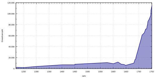 Au début de son histoire en 1220, Berlin était une petite île sur la Sprée de 1 200 habitants. L'immigration des huguenots français à la suite de l'Édit de Potsdam en 1685 a donné une forte impulsion à la ville, alors peuplée de 10 000 habitants. Sa superficie et sa population ont progressé jusqu'en 1747 où elle a dépassé la barre des 100 000 habitants. Le siècle suivant était celui de l'industrialisation et du boom démographique de la ville qui a dépassé le million d'habitants en 1877. L'intégration des communes limitrophes pour créer le grand Berlin en 1920 a fait de la ville pendant les années 1920 et 1930 la plus grande ville du continent européen et la troisième ville du monde après New York et Londres. Elle a connu sa plus grande population pendant la période du national-socialisme en 1942 avec 4 478 102 habitants, avant de baisser drastiquement à la fin de la Seconde Guerre mondiale à 2 807 405. La population a ensuite très légèrement augmenté de quelques dizaines de milliers d'habitants pendant la partition, avant d'accuser une légère baisse après la réunification à la fin des années 1990. La population actuelle augmente aujourd'hui très lentement. La croissance démographique était en 2010 de 5,2 ‰ surtout grâce à un solde migratoire de 4,9 ‰. Le nombre d'enfants par femme en 2012 est de 1,34. Le recensement de 2011 a néanmoins revu à la baisse les estimations précédentes des vingt dernières années[5]. Cet écart statistique entre le recensement et les estimations a créé une forte polémique médiatique nationale[6] et a eu des conséquences graves sur le budget de la ville de Berlin qui a depuis porté plainte.