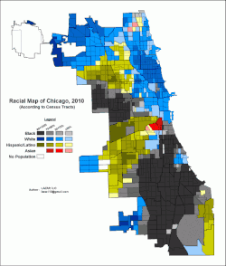 Tandis que la majeure partie de la ville de Chicago et de sa région environnante était, dans les années 1940 et 1950, considérée comme étant ségrégationniste, la sociologie culturelle de Chicago résulte du creuset démographique avec presque les mêmes pourcentages d'Euro-Américains et d'Afro-Américains ainsi que d'importantes populations hispaniques et asiatiques. Aujourd'hui, les Euro-Américains (populations d'ascendance européenne) occupent principalement les quartiers nord (North Side) tandis que les communautés Afro-Américaines, Hispaniques et Latino-Américaines se prolongent radicalement à l'extérieur de Downtown Chicago au profit des quartiers sud (South Side) et des quartiers ouest (West Side). Depuis le début des années 2000, les Asio-Américains ont tendance à s'installer dans les quartiers nord.