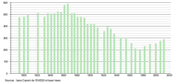 L'évolution du nombre d'habitants est connue à travers les recensements de la population effectués périodiquement dans la commune depuis 1793. Après avoir présenté un maximum en 1866 avec 590 habitants, la population de la commune diminue jusqu'en 1975 avec un minimum à 195 habitants puis reste stable à ce niveau.