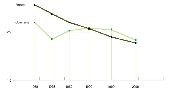 Le nombre de ménages[Note 3] tend à croître plus vite que la population : + 1,72 % par an en moyenne en France métropolitaine pour le nombre de ménages entre 1968 et 2009, + 0,74 % pour la population (tableau ci-après). Le nombre moyen de personnes par ménage tend en effet à baisser : égal à 3,06 en 1968, il n’est plus que de 2,4 en 1999 et de 2,27 en 2009[16]. La tendance est similaire pour la commune. Le nombre moyen de personnes par ménage tend également à baisser : égal à 2,7 en 1968, il n’est plus que de 2,55 en 1999 et de 2,33 en 2009[13].