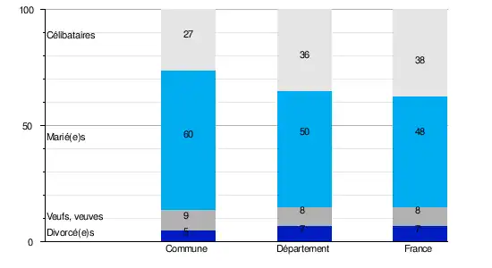 L'état matrimonial légal désigne, selon l'Insee, la situation conjugale d'une personne au regard de la loi : célibataire, mariée, veuve, divorcée[Note 2].En 2009, la commune comptait 26,7 % de célibataires, 59,6 % de personnes mariées, 9,2 % de veufs ou veuves et 4,6 % de divorcé(e)s[13]. Le taux de personnes mariées apparaît ainsi très supérieur à celui du département (49,8 %)[14] mais aussi de la France (47,5 %)[15].