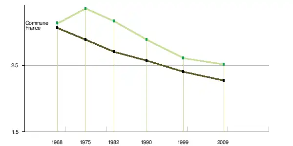 Le nombre de ménages[Note 3] tend à croître plus vite que la population : + 1,72 % par an en moyenne en France métropolitaine pour le nombre de ménages entre 1968 et 2009, + 0,74 % pour la population (tableau ci-après). Le nombre moyen de personnes par ménage tend en effet à baisser : égal à 3,06 en 1968, il n’est plus que de 2,4 en 1999 et de 2,27 en 2009[16]. La tendance est similaire pour la commune. Le nombre moyen de personnes par ménage tend également à baisser : égal à 3,13 en 1968, il n’est plus que de 2,6 en 1999 et de 2,51 en 2009[13].