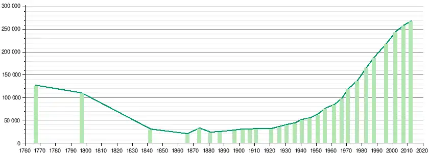 Sources (sauf mention contraire dans le tableau) : Gille 2012, p. 2 de 1767 à 1848, Toullelan 1984, p. 15 de 1866 à 1911, Clairin 1972, p. 720 (± 50) de 1921 à 1967, ISPF 2003 de 1971 à 1977 et ISPF 2015 depuis 1983.