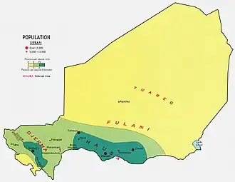 Le Niger est un pays rural. Le taux d’urbanisation de la population est faible (21 % en 2011), mais en progression constante. La région ayant le plus fort taux d'urbanisation, en dehors de la capitale, est curieusement celle d'Agadez, région désertique, en raison de la population de son chef-lieu et des cités minières d'Arlit et Tchirozérine.