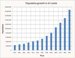 En 2016, la population du Sri Lanka s'élevait à 22,23 millions d'habitants. La croissance démographique du pays est d'environ 0,73 %, d'après la Banque mondiale[13]. Alors qu'elle était de 2,8 % en 1953, de 2,2 % en 1971, de 1,7 % en 1981 et de 1,5 % en 1991[14]. Le pays avait entre 2000 et 2005, un indice de fécondité de 2. Le Sri Lanka a un taux de natalité de 17,6 ‰ et un taux de mortalité de 6,2 ‰[15] et un taux de mortalité infantile 17 ‰.