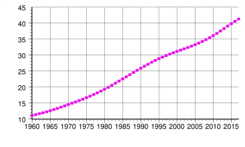 En janvier 2016[19], la population de l'Algérie est évaluée à 40,4 millions d'habitants contre 12,7 millions en 1965[20].