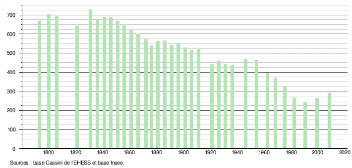 - ↑ Par convention dans Wikipédia, le principe a été retenu de n’afficher dans le tableau des recensements et le graphique, pour les populations légales postérieures à 1999, que les populations correspondant à une enquête exhaustive de recensement pour les communes de moins de 10 000 habitants, et que les populations des années 2006, 2011, 2016, etc. pour les communes de plus de 10 000 habitants, ainsi que la dernière population légale publiée par l’Insee pour l'ensemble des communes.