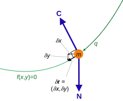 - Si les coordonnées sont données par N vecteurs , un déplacement infinitésimal est noté et nécessite un temps infinitésimal . Un déplacement virtuel est noté et nécessite un temps nul.