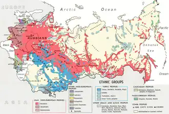 - ↑ Les endonymes des peuples de Russie adoptés dans les années 1925-1930 sont : Finnois, Carèles et Vepses au lieu de Tchoudes, Ukrainiens, Ruthènes ou Houtsoules au lieu de Petits-Russes (Malorusses), Roumains au lieu de Moldaves, Grecs ou lieu de Bondiki ou Ouroums, Arméniens en Crimée au lieu de Tcherkessogaïs, Adygues au lieu de Circassiens du Kouban, Romanès au lieu de Tsiganes, Komis et Permes au lieu de Zyrianes, Samonénètses au lieu de Yourakes, Nénètses au lieu de Samoyèdes, Khantis au lieu d’Ostiaks, Mansis au lieu de Vogoules, Nganassanes au lieu de Boyagres, Kètes au lieu de Tchapoguires, Evenkis et Goldes au lieu de Toungouses, Oïrats au lieu de Kalmouks, Karakalpaks au lieu de Kyzylkoums, Kazakhs au lieu de Kirguiz des plaines, Touvas au lieu de Soïotes, Sakhas au lieu de Yakoutes, Nanaïs, Nivches et Oudegueïs au lieu de d’Orotches, Tchouktches au lieu d’Anadyres, Koryaks au lieu de Kamtchatkes, Aïnous au lieu de Kourils, Innuits au lieu d’Eskimos, Neguidales et Oulches au lieu de Guiliaks, Daures, Meneguires et Solones au lieu de Mandchous. Pour la plupart, ces endonymes sont restés officiels après 1938 (aux Finnois, Roumains, Oïrats et Sakhas près).
