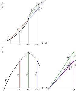 On peut également effectuer une dérivation graphique, sans utiliser de calcul. On approche les tangentes par les cordes comme pour la méthode numérique. Puis, on tire des parallèles à ces droites passant par un point nommé pôle P. On considère l'intersection de ces droites avec la verticale passant par O, le segment [OP] étant horizontal. La hauteur des segments ainsi délimités est proportionnelle à la pente :