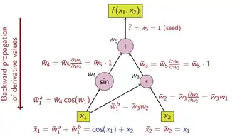 Le graphe de flux des données d'un calcul peut être manipulé pour calculer le gradient de son calcul d'origine. En ajoutant un nœud adjoint pour chaque nœud primaire, et en reliant par des liens adjoints parallèles aux bords primaires mais circulant dans le sens opposé. Les nœuds du graphe adjoint représentent la multiplication par les dérivées des fonctions calculées par les nœuds du primaire. Par exemple, l'addition dans le primaire provoque la sortie dans l'adjoint ; la sortie dans le primaire provoque l'ajout dans l'adjoint[note 1] ; a unaire fonction y = f (x) dans les causes primaires x̄ = ȳ f ′(x) dans l'adjoint, etc.
