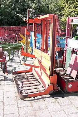- La désileuse en bloc, qui est portée sur un tracteur, un chargeur ou un chargeur télescopique, comprend une fourche qui pénètre horizontalement dans le tas d'ensilage et une scie verticale qui découpe environ une tonne d'ensilage qui sera ensuite distribué aux animaux. Le grand avantage de ce type de désileuse est que le front d'ensilage reste net, ce qui limite les risques de moisissures. L'inconvénient est que l'on ne distribue que de petites quantités.