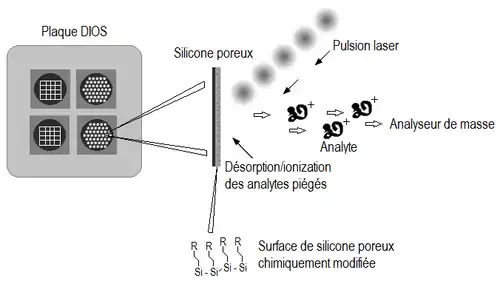 - Comme DIOS utilise des surfaces de dépôt en silicium poreux, elle permet de ne pas utiliser une matrice, contrairement à MALDI (Désorption-ionisation laser assistée par matrice). En effet, le rôle de la matrice est donc remplacé par la surface de dépôt en silicium poreux qui piège la molécule d'analyte et absorbe l'irradiation laser.