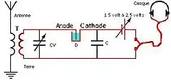 Un circuit composé d'une pile, d'un potentiomètre et d'un écouteur applique une tension au détecteur électrolytique (cuve d'électrolyse). La polarisation électrolytique de l'anode est très rapide. L'anode est un fil de platine très fin de 1/100 de millimètre. Le signal alternatif du circuit inductance-condensateur dépolarise partiellement l'anode aux rythmes de la modulation d'amplitude, ce qui oblige la pile électrique à fournir un nouveau courant pour repolariser l'anode. L'écouteur parcouru par ce courant repolarisant aux rythmes de la modulation d'amplitude fait entendre une image de la modulation (la cathode est un petit godet de platine ou de plomb ou une plaque métallique ou un gros fil de platine ou de plomb).