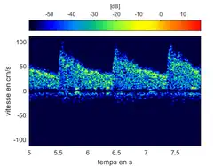 Le tracé de la vélocité en fonction du temps est appelé sonogramme. À partir de celui-ci, les vélocités moyennes (Vm), systoliques (Vs) et diastoliques (Vd) peuvent être mesurées. L'index de pulsatilité (IP), dont un intérêt est qu'il ne dépend pas de l'angle d'insonation, correspond à[4] :