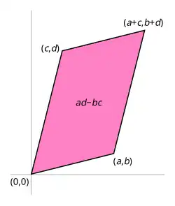 - La valeur absolue du déterminant est égale à l'aire du parallélogramme défini par et (en effet, est la longueur de la hauteur du parallélogramme associée au côté et l'aire du parallélogramme est ).