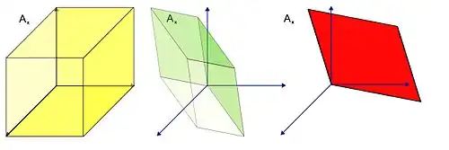 Pour être plus précis, le déterminant d'une application linéaire est un nombre, qui représente un facteur multiplicatif pour les volumes. Si le cube jaune est de volume 1, alors le volume du cube vert est la valeur absolue du déterminant de la première application. La deuxième application a un déterminant nul, ce qui correspond à un aplatissement des volumes.
