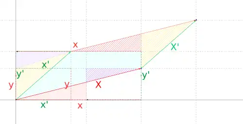 Ce dessin correspond à un cas particulier de la formule de bilinéarité puisque les orientations ont été choisies de façon que les aires aient le même signe, mais il aide à en saisir le contenu géométrique.