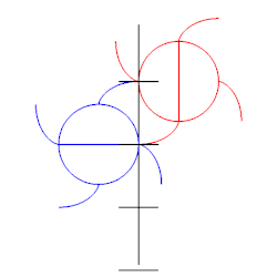 - Le contact entre les dents conjuguées à développante sur des roues menée et menante se produit le long d'une droite tangente aux cercles de base de ces roues. C'est ce qu'on appelle la ligne d'action. Elle passe le plus souvent entre les cercles (engrenage conventionnel) mais peut être à l'extérieur (engrenage paradoxal).