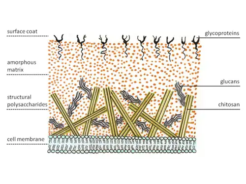La paroi est une structure à plusieurs couches et sa composition varie en fonction des différentes espèces de champignons et des conditions environnementales. La chitine et les β-glucanes sont des polysaccharides qui forment la structure de base de la paroi fongique[2]. La chitine (polymère de β1-4 N-acétylglucosamine) est synthétisée par une chitine synthase ou synthétase. Cette molécule est retrouvée en abondance dans l'exosquelette des insectes qui n'est pas présent chez les mycètes. « La forme et l’intégrité des champignons dépendent des propriétés mécaniques de la paroi cellulaire »[7]. D’autres composants de la paroi fongique sont les mannoprotéines, les glycoprotéines, la mélanine et les sporopollénines.