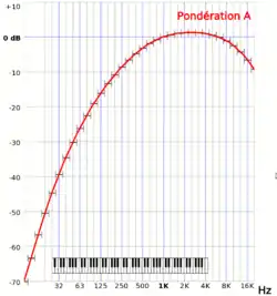 - ↑ (en) Dictionnaire Brüel & Kjær ; glossaire de l'Union européenne sur l'exposition au bruit ; « La pondération A simule la réponse de l'oreille pour des faibles niveaux de pression acoustique » (« A weighting simulates the human ear's loudness characteristic at low sound pressure levels ») (en) T. W. Pickett, « New All-Transistor Sound Meter », Journal of the Audio Engineering Society, vol. 10, no 4, , p. 334-336.