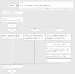 Un diagramme DRAKON-C générant la séquence de Fibonacci.