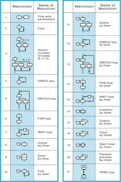 DRAKON n'a pas seulement des icônes, mais également des macro-icônes. Les macro-icônes sont les mots graphiques du langage DRAKON. Tout comme les mots sont faits de lettres, les macro-iсônes (mots graphiques) sont constitués d'icônes (lettres graphiques). Il existe 21 macro-icônes dans le langage DRAKON.