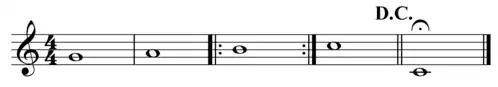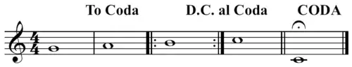 - Da Capo al Coda (souvent abrégé en DC al Coda) : Répétez depuis le début jusqu'à un endroit indiqué, puis jouez la partie de queue (la « Coda »). Il demande au musicien de revenir en arrière et de répéter la musique depuis le début (« Capo »), et de continuer à jouer jusqu'à ce que l'on atteigne le premier symbole de coda. Après avoir atteint le premier symbole coda, passez au deuxième symbole coda et continuez à jouer jusqu'à la fin. La partie du morceau allant de la deuxième coda à la fin est souvent appelée la « coda » du morceau, ou littéralement « la queue ». Cela peut également être indiqué en utilisant simplement les mots al Coda, après quoi le musicien doit passer au mot écrit Coda.