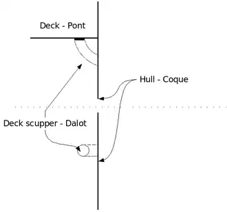- ↑ Cette fermeture - cowhide en anglais rappelle la matière de fabrication - est clouée à l'aide de longs clous à mangères, puis à plomb de plus de 3 cm, sur l'avant de l'ouverture extérieure du dalot, de façon à couvrir l'orifice du dalot. L'eau de bord ne s'échappe pas quand le navire va de l'avant.