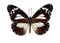 C'est un grand papillon noir marqué de nombreuses taches ovales blanches, formant une plage blanche dans la partie basale. Le verso a une ornementation identique aux antérieures et de plus aux postérieures une double ligne submarginale de points blancs et des taches orange.