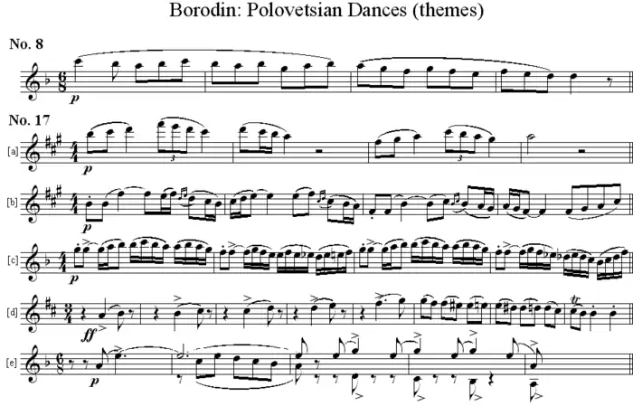 Ces danses dont le thème principal se trouve ci-dessous n'incluent pas la Marche polovtsienne qui ouvre l'acte III (no 18).
