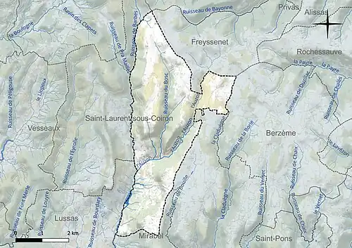 En cheminant depuis le Nord dans le sens des aiguilles d'une montre: Fialouse, Cornas, Oriple, Boulègue, La Prade, Le Mazel, Cadet-Bosc, Les Aymas, Senouilhet, Le Serre-La Croix des Avias, Couffins, Le Clapas, Vendrias, Pradinasses, Le Bouschet, Le Ranchet-Auzon[12]