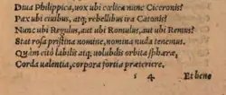 La métrique de ce poème n'est pas moins remarquable que sa diction; c'est un hexamètre dactylique en trois sections, avec la césure essentiellement bucolique seule, avec des rimes à queue et une rime léonine féminine entre les deux premières sections; Les versets sont techniquement connus sous le nom de leonini cristati trilices dactylici et sont si difficiles à construire en quantité que l'écrivain invoque l'inspiration divine (l'impulsion et l'influx de l'esprit de sagesse et de compréhension) comme le principal agent dans l'exécution d’un effort de ce genre aussi étendu. Le poème commence ainsi: